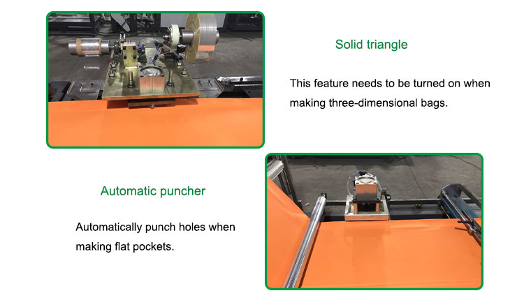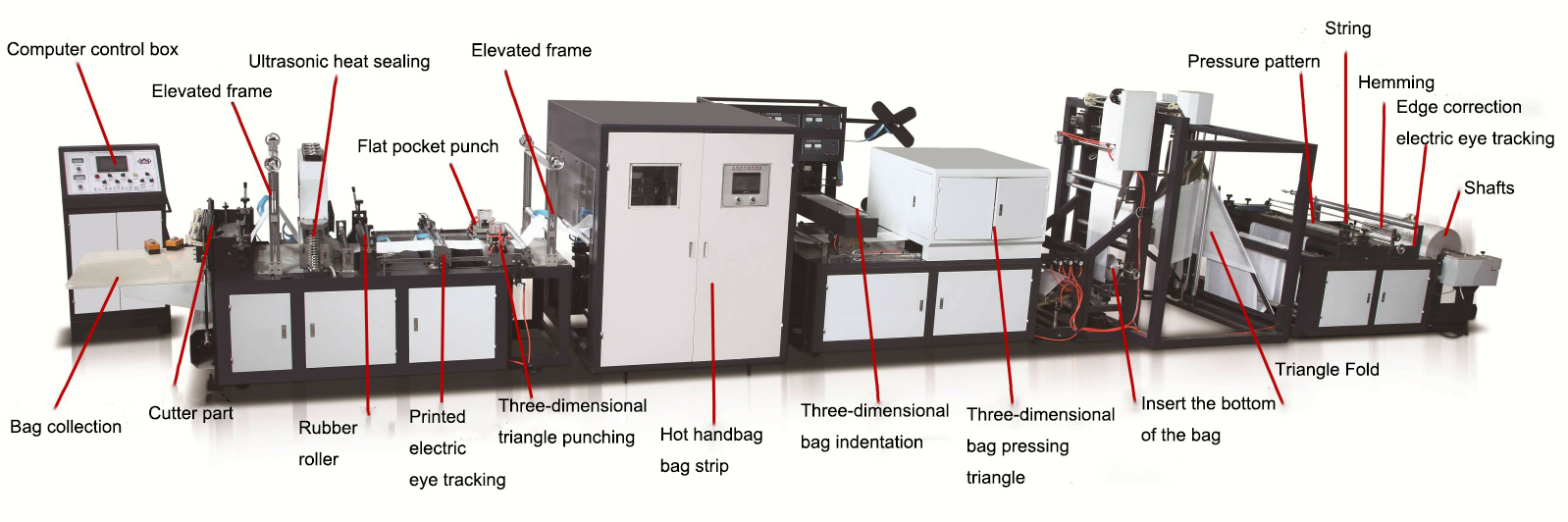 The machine is made of non-woven fabrics, which can process a variety of different specifications, different types of non-woven vest bags, flat pockets, rope bags, etc. The machine integrates electromechanical, using LCD touch screen operation. Equipped with step-adjustable fixed length, photoelectric tracking, computer automatic positioning, computer automatic edge correction, accurate and stable. Automatic counting can set the counting alarm, automatic punching and other industrial control devices, so that the finished product sealing line is firm and the tangent is beautiful.